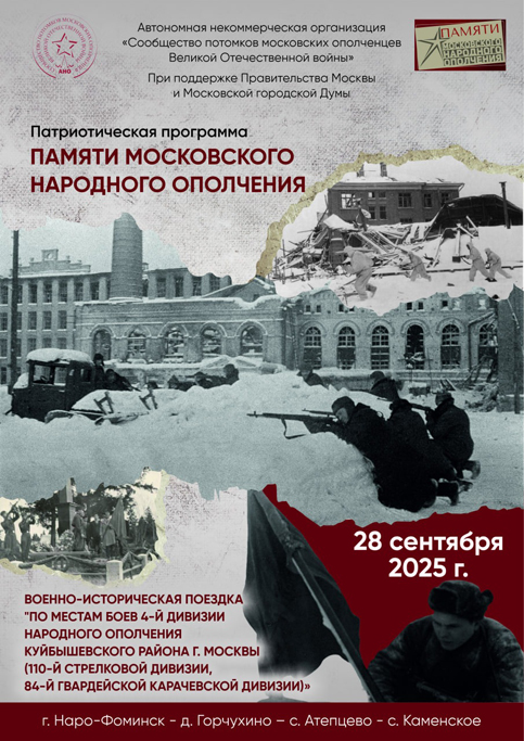 28 сентября 2025 года состоялась военно-историческая поездка «По местам боев 4-й дивизии народного ополчения Куйбышевского района г. Москвы (110-й стрелковой дивизии, 84-й гвардейской Карачевской дивизии)» по маршруту Сходня – Наро-Фоминск – д. Горчухино – с. Атепцево – с. Кампенское – Сходня.