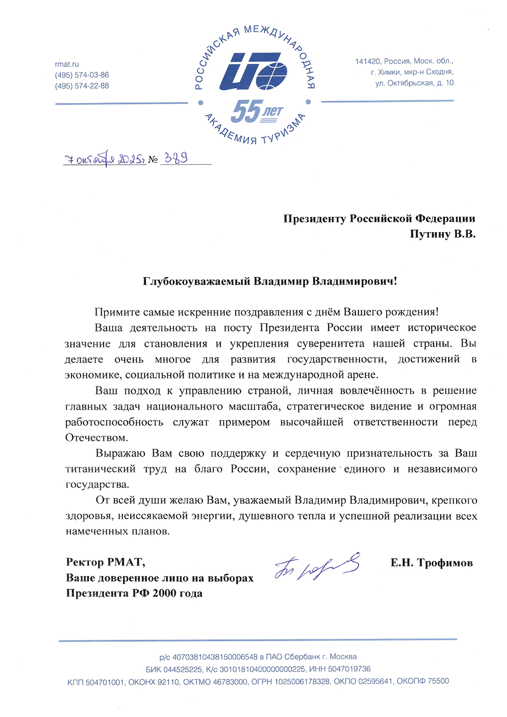 РЕКТОР АКАДЕМИИ ПОЗДРАВИЛ ПРЕЗИДЕНТА РОССИИ ПУТИНА В.В. С ДНЕМ РОЖДЕНИЯ