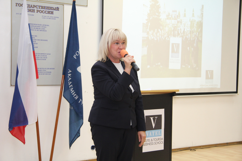 Далее от имени ректора РМАТ, Трофимова Евгения Николаевича, выступила проректор-декан Факультета менеджмента туризма Алилуйко Елена Аркадьевна. Она поздравила студентов и сообщила важную новость: в новом учебном году отделение «Ватель-РМАТ» открылось в основном отделении РМАТ на Сходне. Теперь и в Московской области студенты РМАТ могут учиться на программе двух дипломов, получая опыт работы в международных отелях.