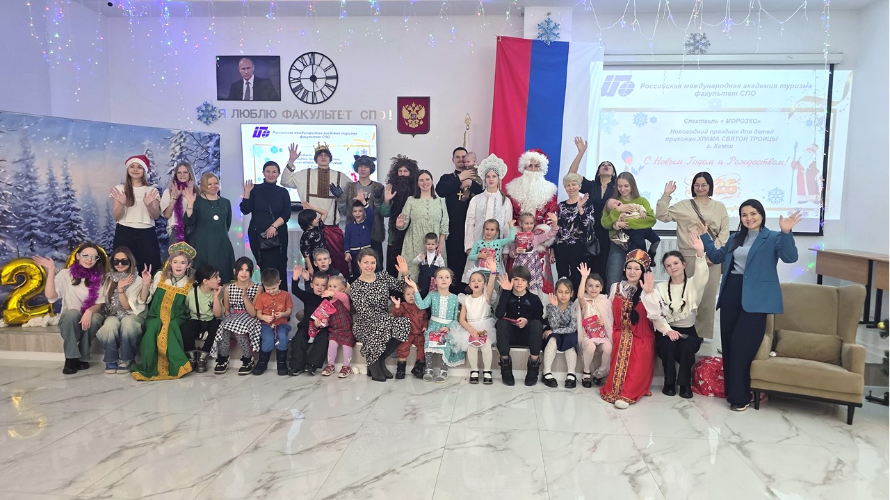 С 24 по 26 декабря 2025 года талантливые студенты факультета среднего профессионального образования РМАТ организовали и провели интерактивный спектакль «Морозко» для детей сотрудников и преподавателей Академии, врачей и медсестер Химкинской взрослой поликлиники № 8 и Химкинской областной больницы № 1, а также для детей сотрудников Сходненского отдела полиции УМВД России по городскому округу Химки и МЧС России.