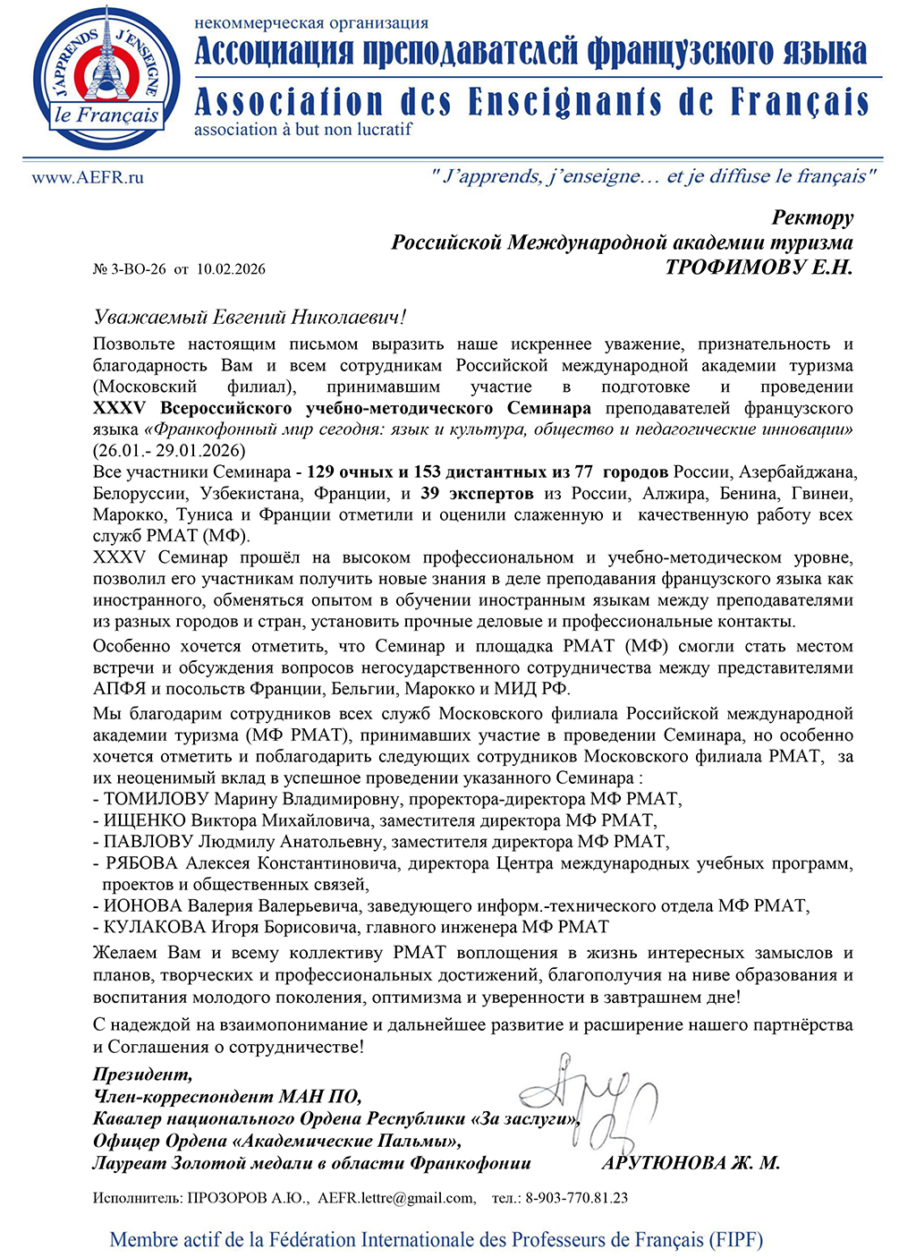 БЛАГОДАРНОСТЬ РЕКТОРУ И СОТРУДНИКАМ РМАТ ЗА УЧАСТИЕ В ПОДГОТОВКЕ И ПРОВЕДЕНИИ ХХХV ВСЕРОССИЙСКОГО УЧЕБНО-МЕТОДИЧЕСКОГО СЕМИНАРА ПРЕПОДАВАТЕЛЕЙ ФРАНЦУЗСКОГО ЯЗЫКА