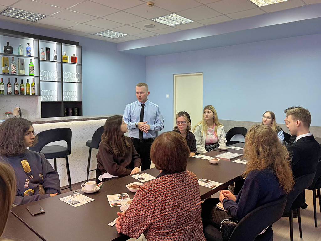 За чашкой кофе состоялась беседа, в которой приняли участие проректор, декан факультета СПО Жидких Владимир Александрович и заведующий кафедрой туризма и гостиничного дела Арсений Роман Михайлович. Студентов, выпускающихся в 2026 году, интересовали разнообразные вопросы о предстоящем обучении.