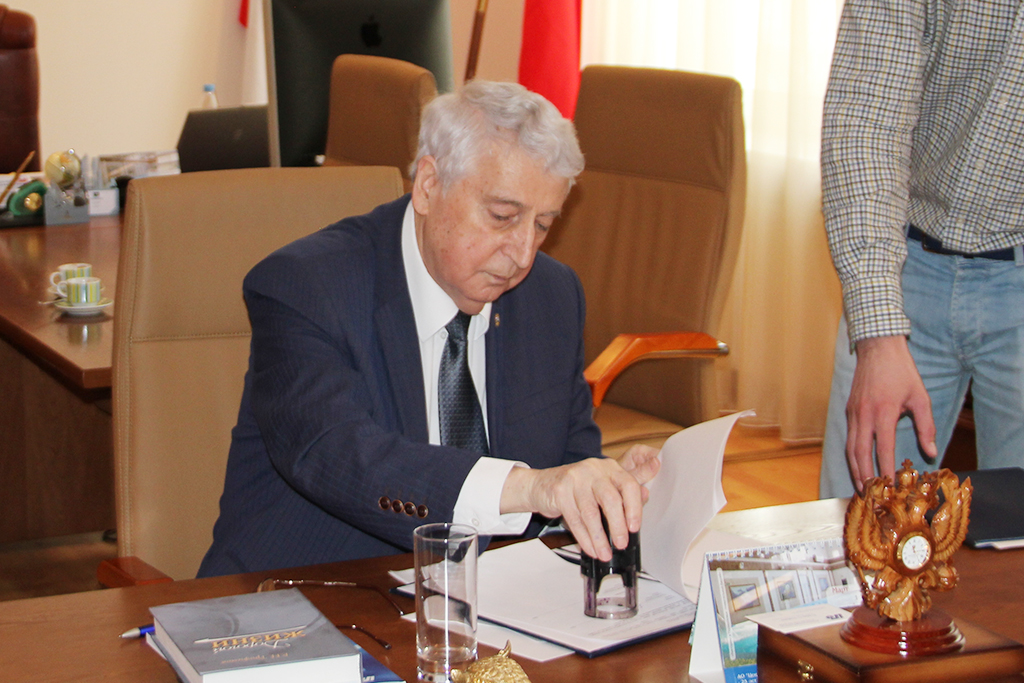 Затем состоялся приём у ректора РМАТ, доктора политических наук Евгения Николаевича Трофимова. Ректор рассказал о перспективах развития образования в России, о месте РМАТ в этой системе как эффективного вуза, поделился предложениями о дальнейшем сотрудничестве. А оно существует уже не первый год. В связи с объединением и изменением статуса учебного заведения стало необходимым подписание нового договора.