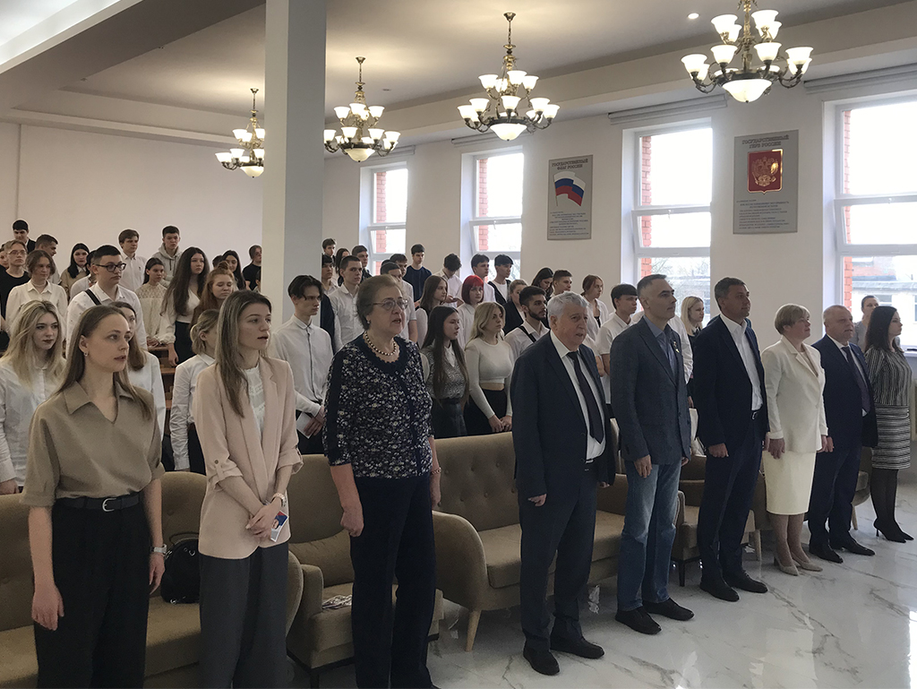 Мероприятие открылось исполнением гимна России и поднятием флага Российской Федерации студентом 2 курса - Фёдором Лозневым.