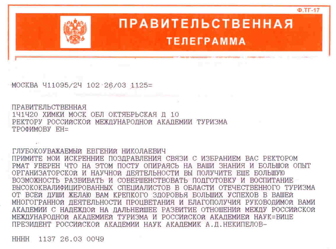 Разрешите мне от имени Международной ассоциации научных экспертов по туризму (AIEST) поздравить Вас в связи с единодушным избранием на ответственный пост ректора престижной Российской международной академии туризма (РМАТ).
