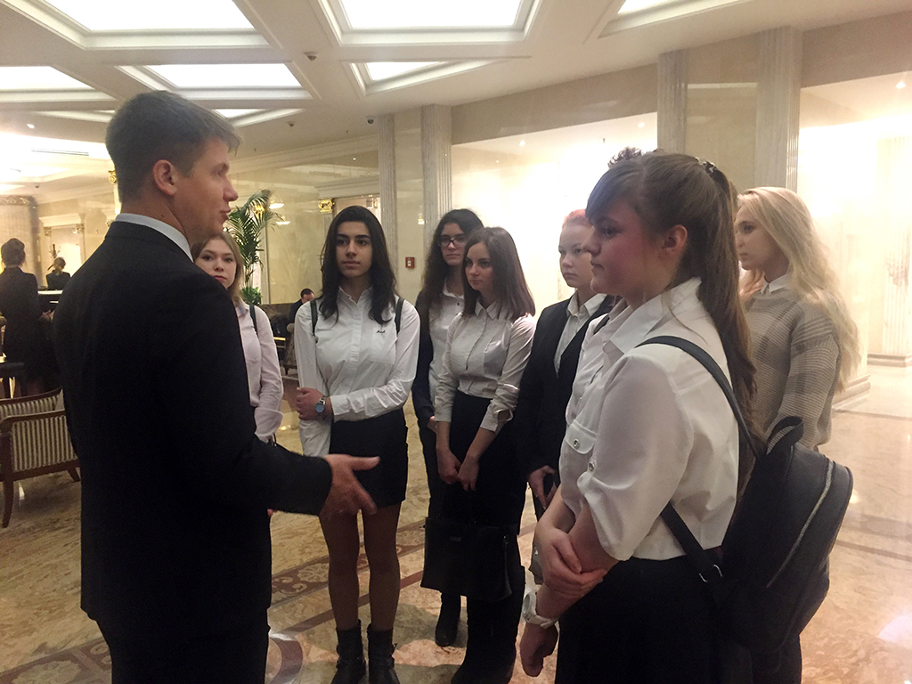 Студентов радушно встретил Горошников Андрей, директор департамента развития персонала. Он рассказал об истории гостиницы «Украина», которая отмечала в этом году 61 год, провел обзорную экскурсию по отелю, рассказал о работе основных служб отеля - службе приема и размещения, службе питания, безопасности, службе обслуживания номерного фонда, конференц-залов и банкетной службы отеля. В отеле класса люкс должно быть все безупречно.