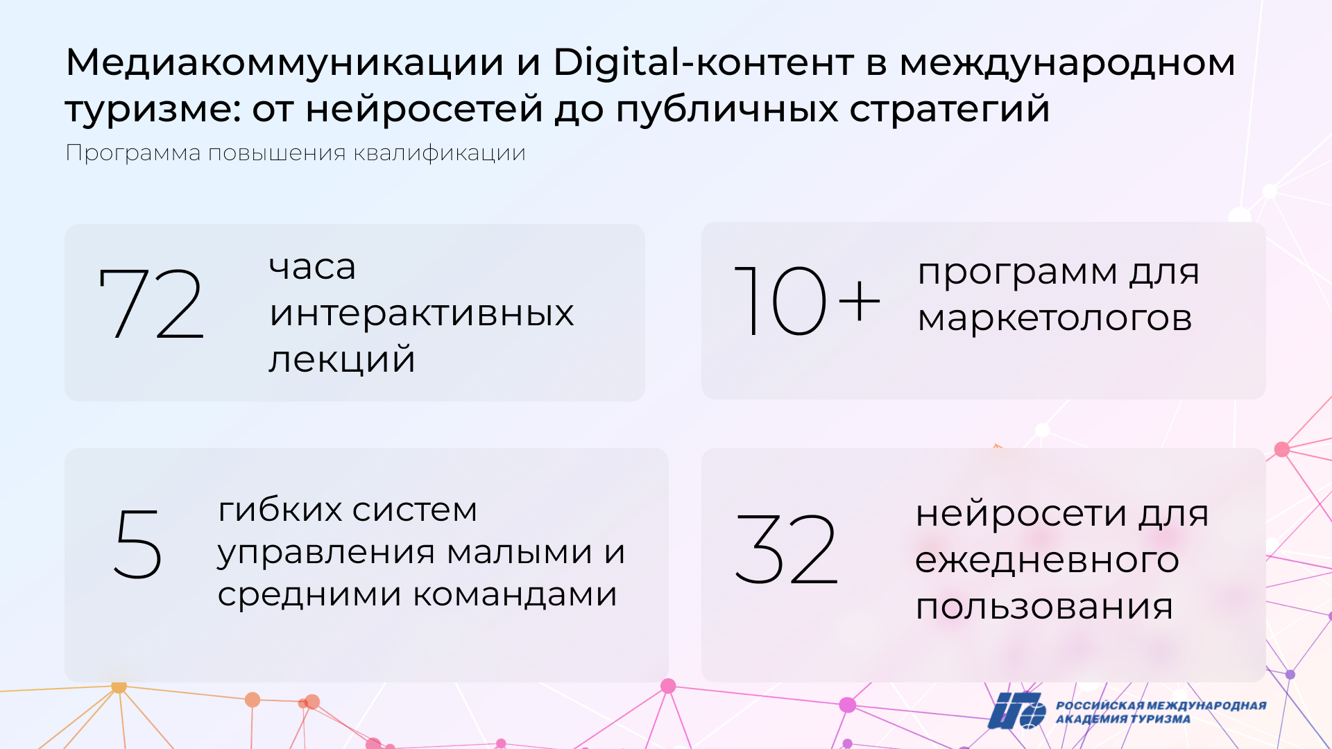 и современными трендами в digital-контенте для туристической отрасли. Слушатели разберут теории влияния медиаповестки, узнают, как эффективно строить визуальные и текстовые коммуникации, освоят возможности генерации контента с помощью нейросетей и практики применения