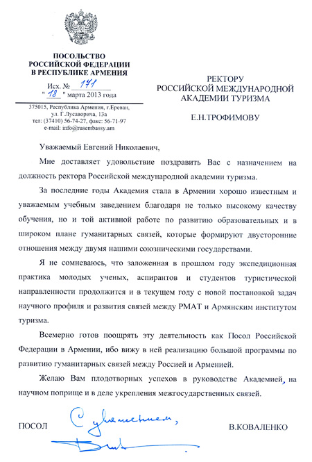 Мы были бы горды продолжением сотрудничества с Вами, особенно в той части, которая затрагивает деятельность учрежденной в РМАТ Кафедры ЮНВТО.