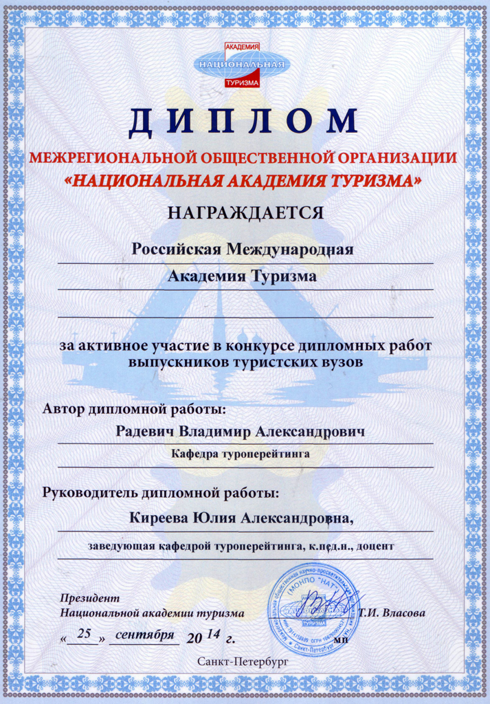 По итогам конкурса Российская международная академия туризма, а также ее выпускники Владимир Радевич, Анна Кириллова и их научный руководитель Ю.А. Киреева награждены дипломами за активное участие в конкурсе дипломных работ (проектов).