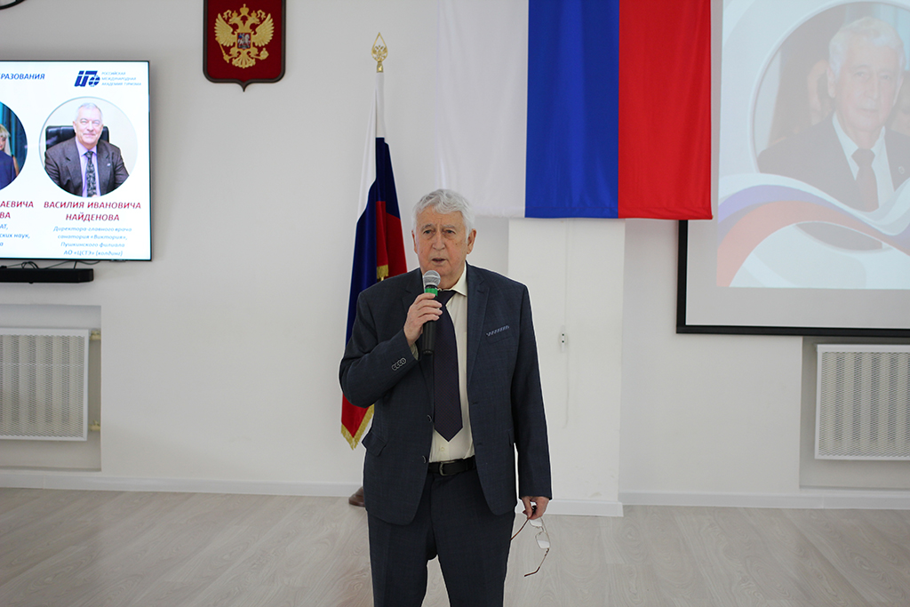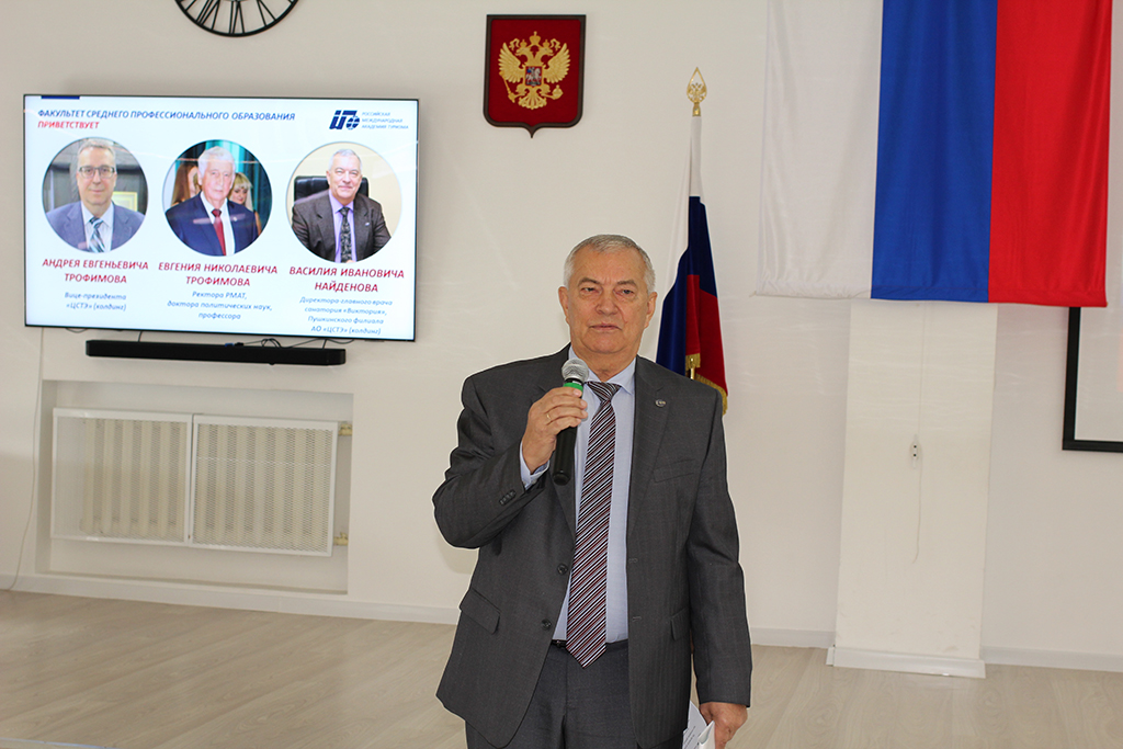 После делового разговора состоялась встреча директора, главного врача санатория «Виктория» Пушкинского района Московской области Василия Ивановича Найдёнова со студентами факультета среднего профессионального образования. Презентацию он начал с рассказа о создании холдингом в начале нынешнего столетия трёх санаториев: «Виктория» в Кисловодске, «Виктория» в Московской области и «Светлана» в городе Сочи. И у каждого студента есть шанс получить работу в любом из них. Это – предприятия высокого класса. Не раз они удостаивались профессиональных наград. Кисловодский и пушкинский филиалы холдинга на XX юбилейном Всероссийском форуме «Здравница – 2021» завоевали по две золотые медали в номинациях «За лучшие инновационные технологии в санаторно-курортной сфере» и «Лучшая здравница по комплексному оздоровлению».