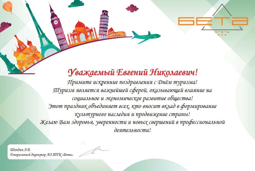 ГЕНЕРАЛЬНЫЙ ДИРЕКТОР АО ТГК "БЕТА" А.Б. ШИНДИН ПОЗДРАВЛЯЕТ С ДНЕМ ТУРИЗМА!