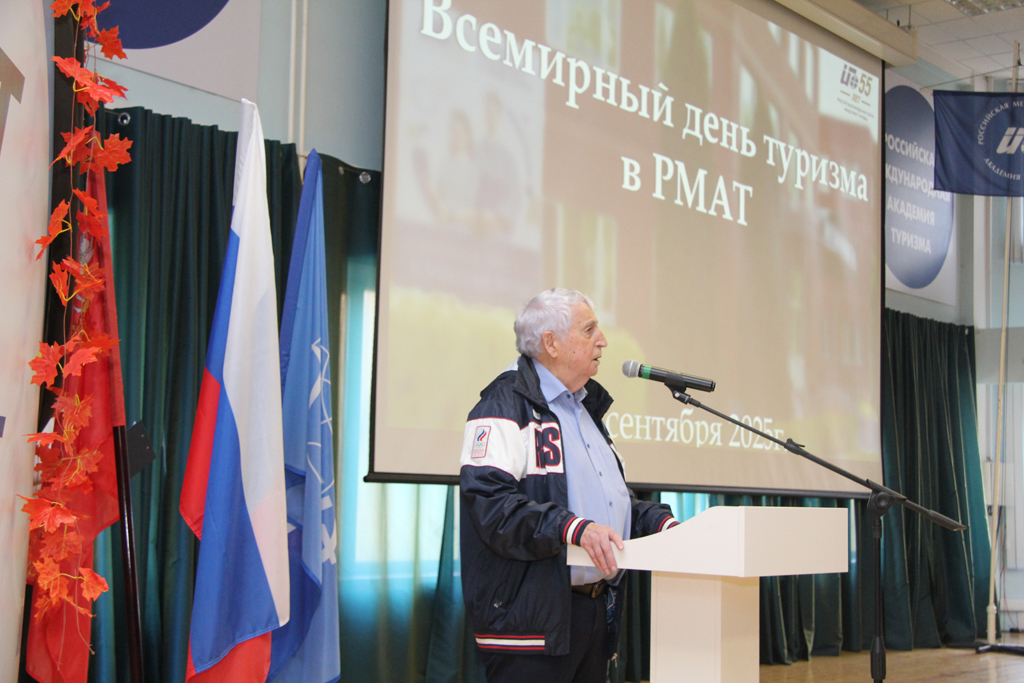 Торжественная часть началась в Главном учебном корпусе с поднятия флага Академии. С приветственным словом выступил ректор РМАТ, доктор политических наук, почётный работник высшего образования Российской Федерации Евгений Николаевич Трофимов. Поздравляя с Всемирным днём туризма, он отметил, что студенты Академии — это будущее отрасли. В России реализуется беспрецедентный по масштабам проект "5 морей и озеро Байкал", который кардинально преобразит туристическую инфраструктуру страны. На побережьях Японского, Каспийского, Чёрного, Азовского, Балтийского морей и легендарного Байкала будут созданы современные всесезонные курорты мирового уровня. Академия гордится тем, что готовит специалистов, которые превращают эти амбициозные проекты в реальность.
