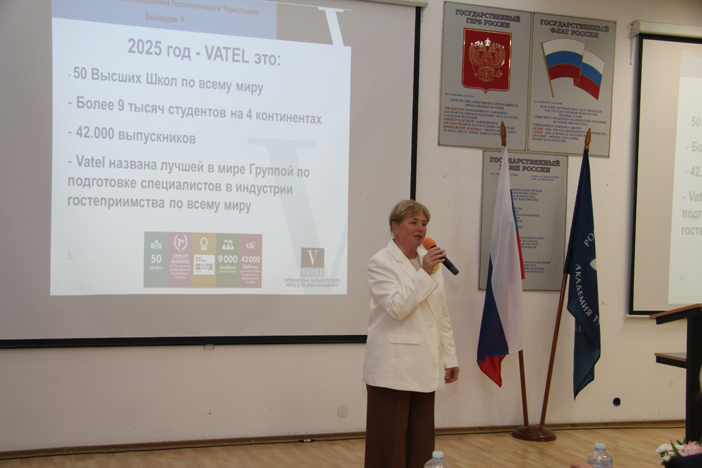 Далее от имени ректора РМАТ, Трофимова Евгения Николаевича, выступила проректор-декан Факультета менеджмента туризма Алилуйко Елена Аркадьевна. Она поздравила студентов и сообщила важную новость: в новом учебном году отделение «Ватель-РМАТ» открылось в основном отделении РМАТ на Сходне. Теперь и в Московской области студенты РМАТ могут учиться на программе двух дипломов, получая опыт работы в международных отелях.