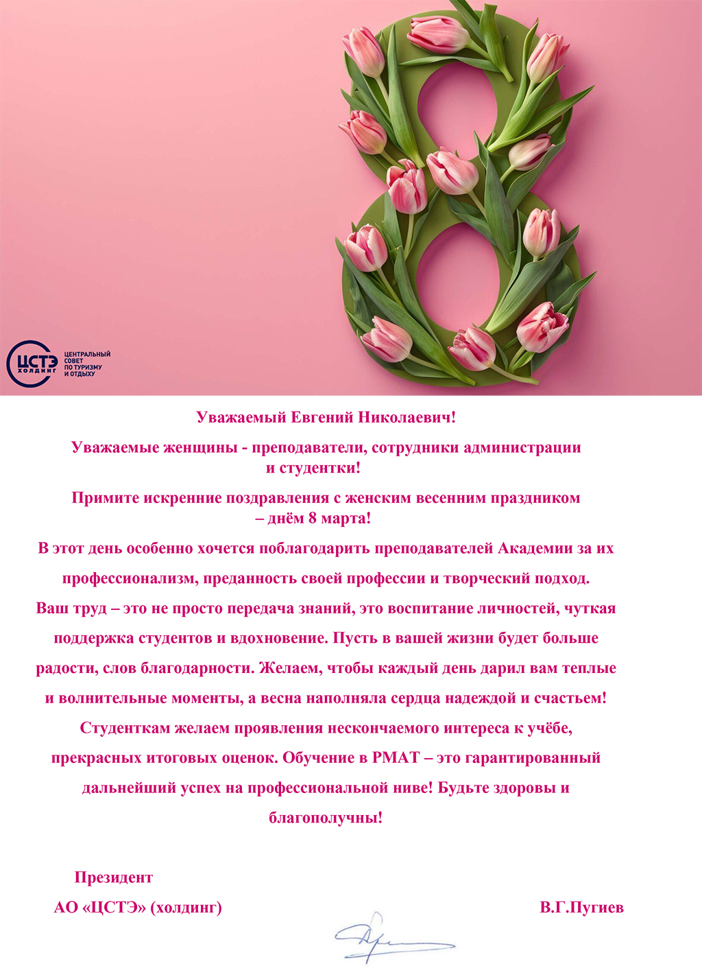 ПРЕЗИДЕНТ АО "ЦСТЭ" (ХОЛДИНГ) В.Г. ПУГИЕВ ПОЗДРАВЛЯЕТ С 8 МАРТА