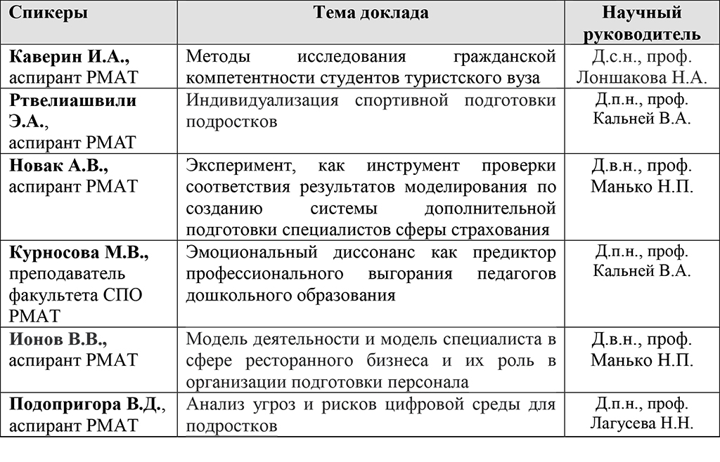 9 апреля 2026 года в Российской международной академии туризма прошла XVII Международная научная школа магистрантов, аспирантов и молодых учёных (международная научная конференция) "Современные тенденции научных исследований в профессиональном образовании, экономике и управлении”.