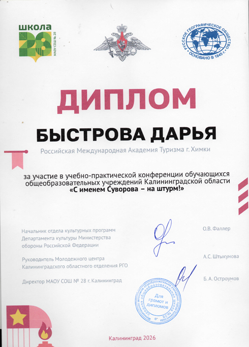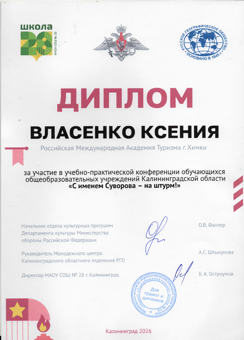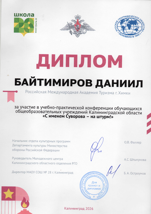 7 апреля 2026 года активисты Музея боевой славы РМАТ приняли участие в учебно-практической конференции «С именем Суворова – на штурм!» в городе Калининграде.
