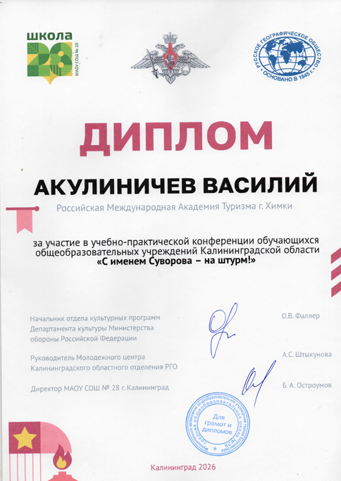 Конференция, в которой приняли участие студенты РМАТ, – одно из первых в рамках мероприятий, посвященных 300-летию со дня рождения А.В. Суворова; указ № 327 о праздновании юбилея великого полководца Президент Российской Федерации В.В. Путин подписал 17 мая 2025 года. Соорганизаторы конференции – Молодежное Правительство Калининградской области, Молодежный совет Управления Федерального казначейства по Калининградской области, Калининградское отделение Русского географического общества.