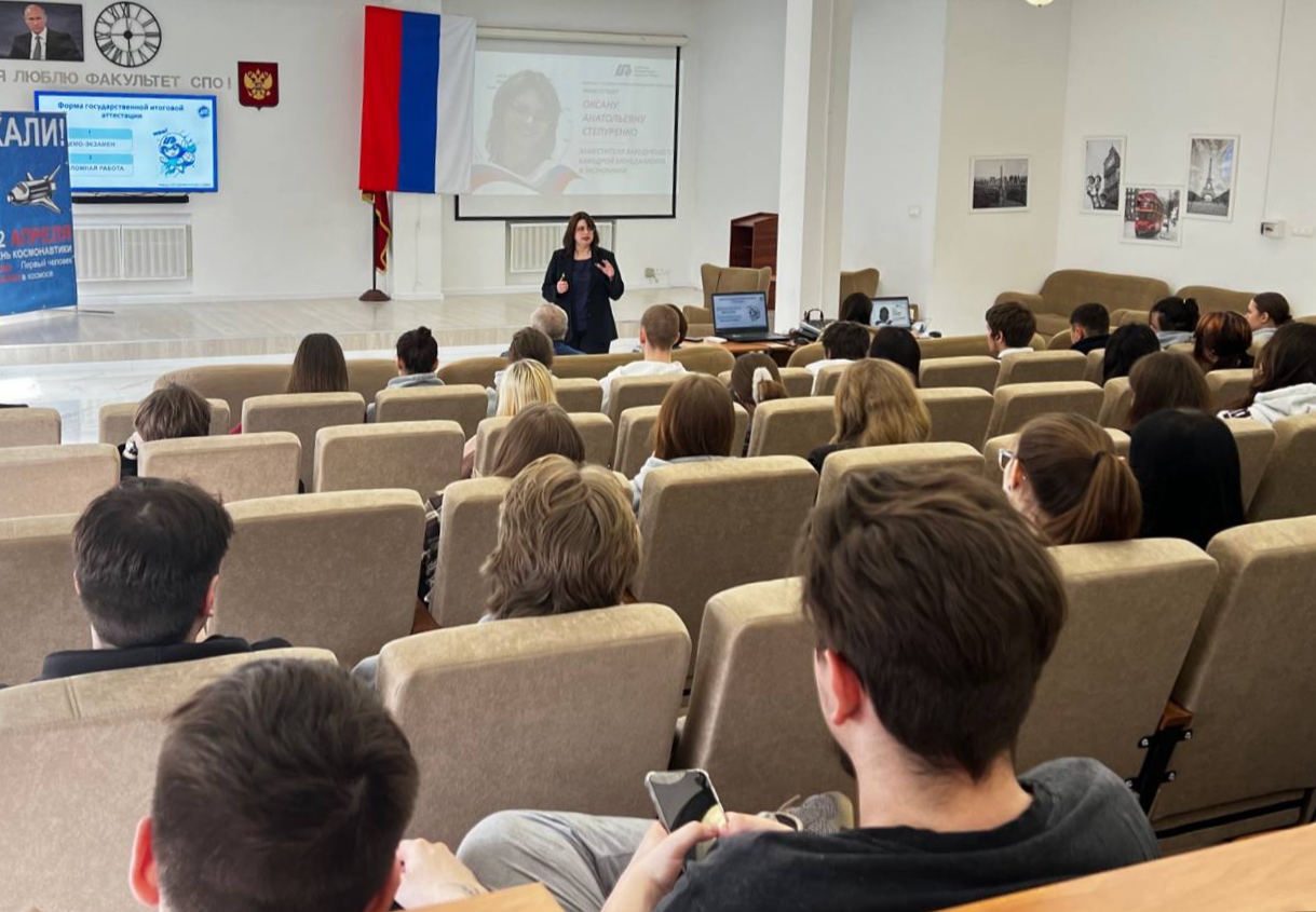 На встрече со студентами специальности СПО «Юриспруденция» заведующая кафедрой гражданско-правовых дисциплин, кандидат педагогических наук, доцент Гусева Ирина Витальевна также отметила два ключевых момента образовательного пути: сдачу демо-экзамена и защиту выпускной квалификационной работы, а также дальнейшему поступлению на программы высшего образования в Российской международной академии туризма.