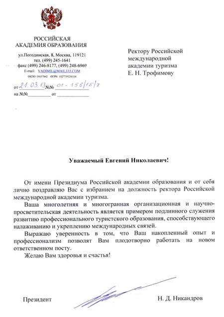 Поздравление Трофимова Е.Н. - ректора РМАТ - от министерства по туризму Московской области