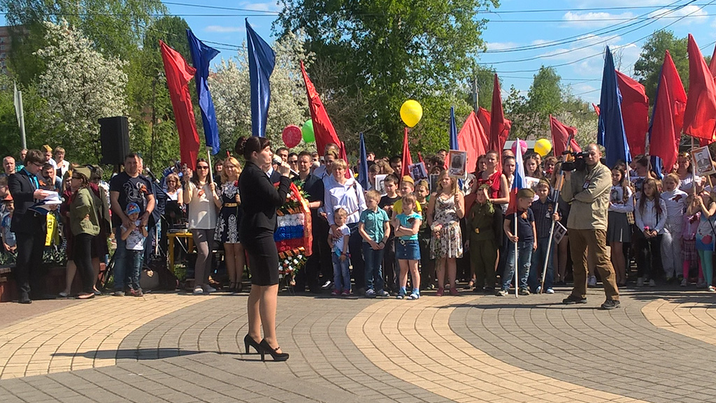 В этот понедельник, 9 мая на Сходне у памятника «Скорбящей матери» состоялся митинг, посвященный Дню Победы. На митинг в этом году, возложить цветы и помянуть героев войны, пришло много жителей микрорайона Сходня. От имени всей молодежи, с благодарственным словом ветеранам, выступила студентка 1 курса РМАТ Исаева Виктория.