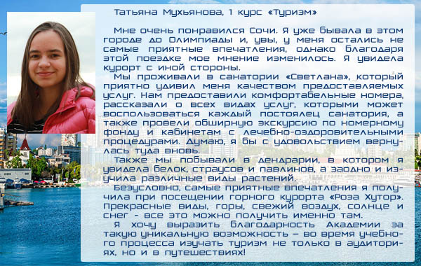 17-20 октября 2017 года студенты Российской международной академии туризма приняли участие в образовательном туре в г. Сочи, целью которого было изучение туристских возможностей курорта. Спустя неделю после возвращения, студенты делятся впечатлениями о поездке.