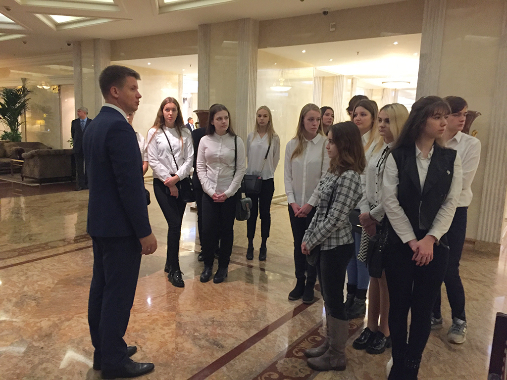 Студентов радушно встретил Горошников Андрей, директор департамента развития персонала. Он рассказал об истории гостиницы «Украина», которая отмечала в этом году 60 лет, провел обзорную экскурсию по отелю, уделив большое внимание службе приема и размещения, службе питания, безопасности, службе обслуживания номерного фонда.