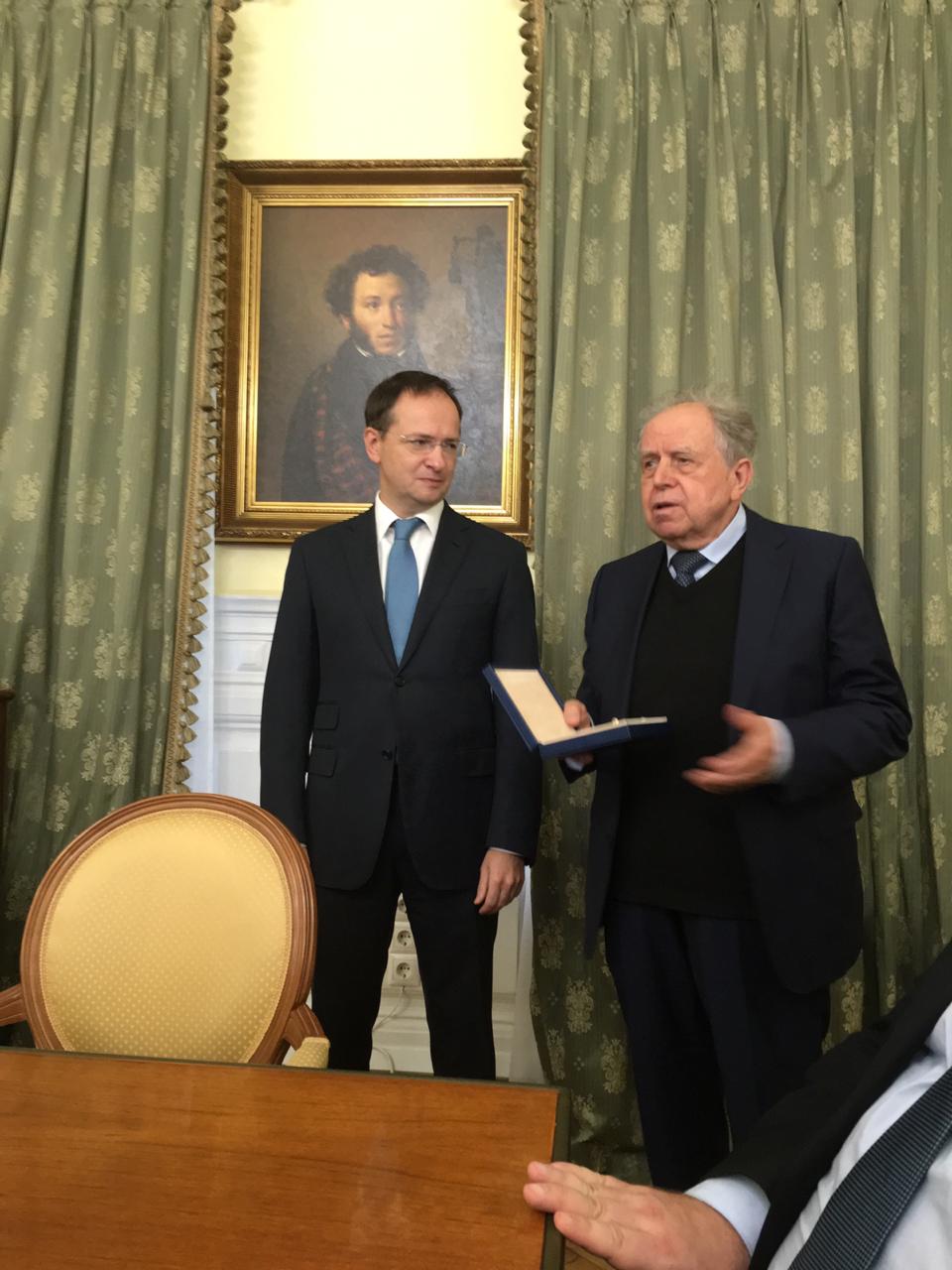 Министр культуры Мединский В.Р. вручает президенту АО "ЦСТЭ" (холдинг) Пугиеву В.Г.