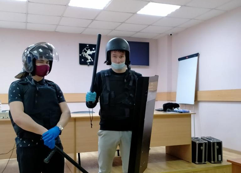 Студентам была предоставлена возможность примерить полицейское обмундирование – каски, бронежилеты, ношение которых требует хорошей физической подготовки.