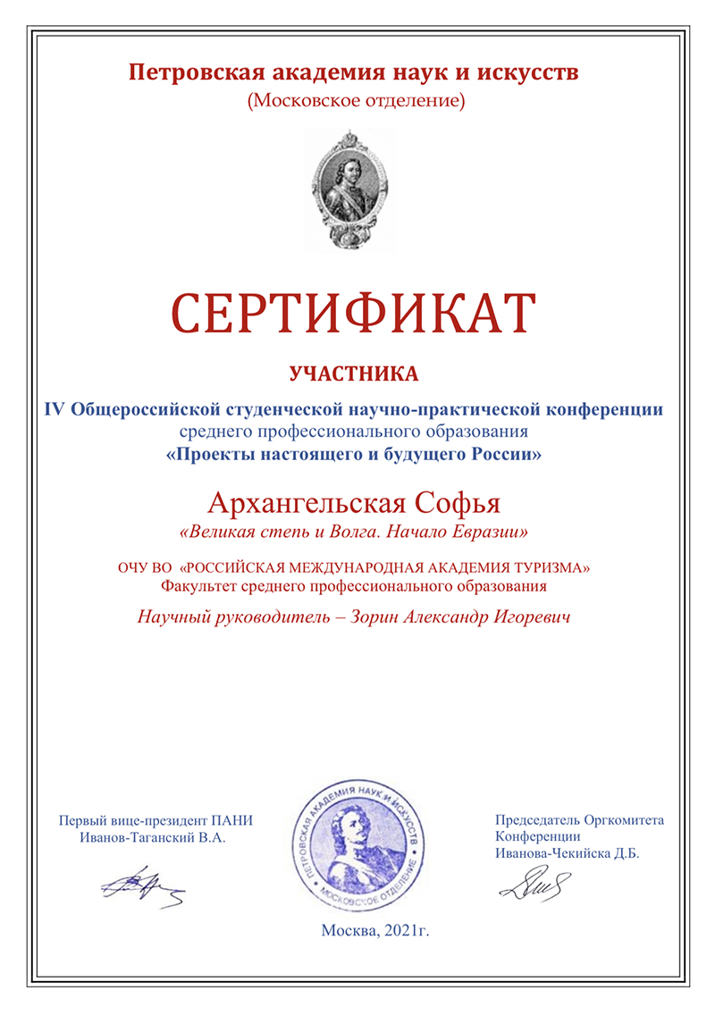 Архангельская София за свой проект «Великая степь и Волга. Начало Евразии» получила Сертификат участника конференции и Диплом Петровской академии наук и искусств», за актуальное исследование, представленное на IV Общероссийской студенческой конференции среднего профессионального образования «ПРОЕКТЫ НАСТОЯЩЕГО И БУДУЩЕГО РОССИИ». Руководителем научного проекта является Зорин Александр Игоревич – доктор педагогических наук, доцент ВАК, преподаватель факультета СПО.
