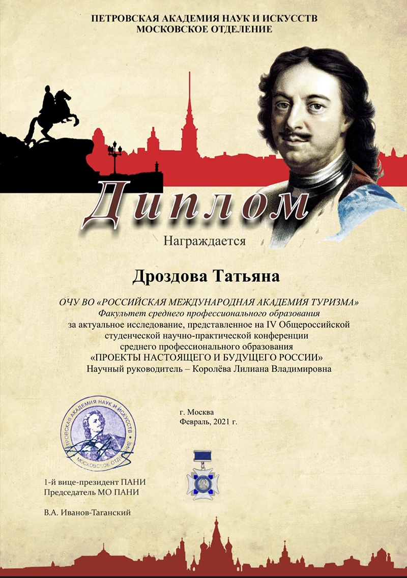 Дроздова Татьяна за свой проект «Развитие экологического туризма в регионах России на примере заповедника «Приволжская Лесостепь» получила Сертификат участника конференции и Диплом Петровской академии наук и искусств, за актуальное исследование, представленное на IV Общероссийской студенческой конференции среднего профессионального образования «ПРОЕКТЫ НАСТОЯЩЕГО И БУДУЩЕГО РОССИИ». Руководителем научного проекта является Королева Лилиана Владимировна – кандидат педагогических наук, доцент ВАК, преподаватель факультета СПО.