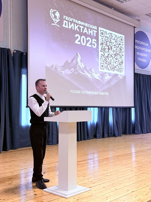 Открыла географический диктант 2025 проректор-декан факультета менеджмента туризма РМАТ, к.п.н., Алилуйко Елена Аркадьевна, которая рассказала об истории этой акции. Елена Аркадьевна отметила, что ректор Российской международной академии туризма Евгений Николаевич Трофимов является членом Комиссии по развитию туризма при Русском географическом обществе. Под его руководством и в этом году Академия снова стала площадкой проведения географического диктанта, уже в восьмой раз.