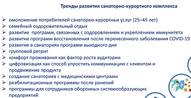 Последствия коронавирусной инфекции ложатся дополнительной нагрузкой на систему здравоохранения РФ. Они могут проявляться не сразу, а через 4-5 месяцев в виде разного рода миокардитов и прочих сердечно-легочных заболеваний. Дополнительной нагрузкой станут военные из зоны военных действий, которым нужно не только залечивать понесенные раны, но снимать стресс. Санатории способны решать такие задачи. И, конечно, общее старение населения – это те вызовы, с которыми придется столкнуться. Работа над решением проблем ведется, в частности, формируется система оценок санаторно-курортного комплекса, разрабатываемая совместно с Минздравом. Нормативное регулирование должно быть нацелено на привлечение инвестиций в отрасль.