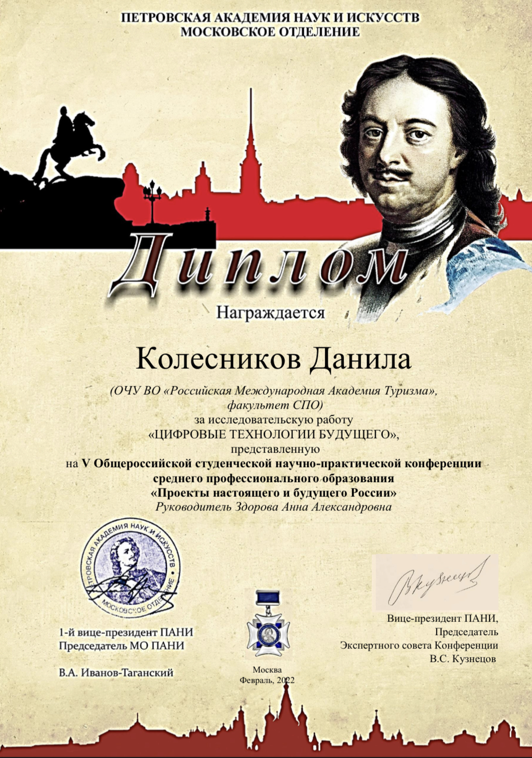 Студент 1-го курса специальности «Экономика» Колесников Даниил за исследовательскую работу «Цифровые технологии будущего». Руководителем научного проекта является Здорова Анна Александровна - кандидат педагогических наук, преподаватель факультета СПО.
