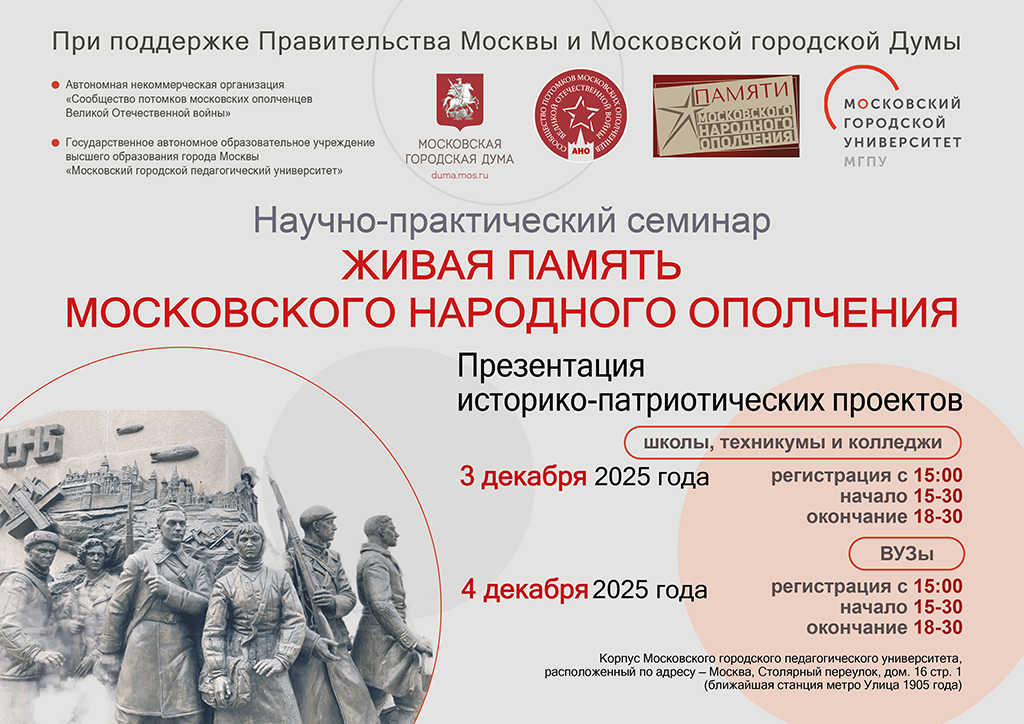 Семинар посвящен практическим аспектам по сохранению памяти Московского народного ополчения; МГПУ проводит его уже в третий раз. Семинар стал профессиональным смотром и обсуждением лучших практик, реализованных образовательными организациями и сообществами потомков ополченцев в юбилейном году 80-летия Великой Победы, объявленном в России Годом Защитника Отечества.