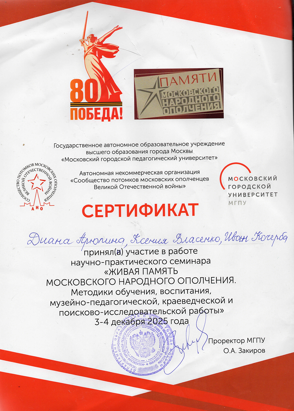 Активисты Музея боевой славы РМАТ приняли участие в научно-практическом семинаре: «Живая память Московского народного ополчения. Методика обучения, воспитания, музейно-педагогической, краеведческой и поисково-исследовательской работы». Организаторы семинара – Автономная некоммерческая организация «Сообщество потомков московских ополченцев Великой Отечественной войны» и Московский городской педагогический университет.