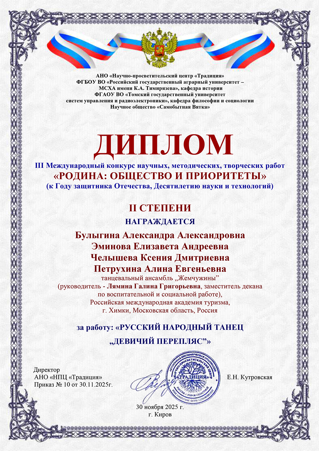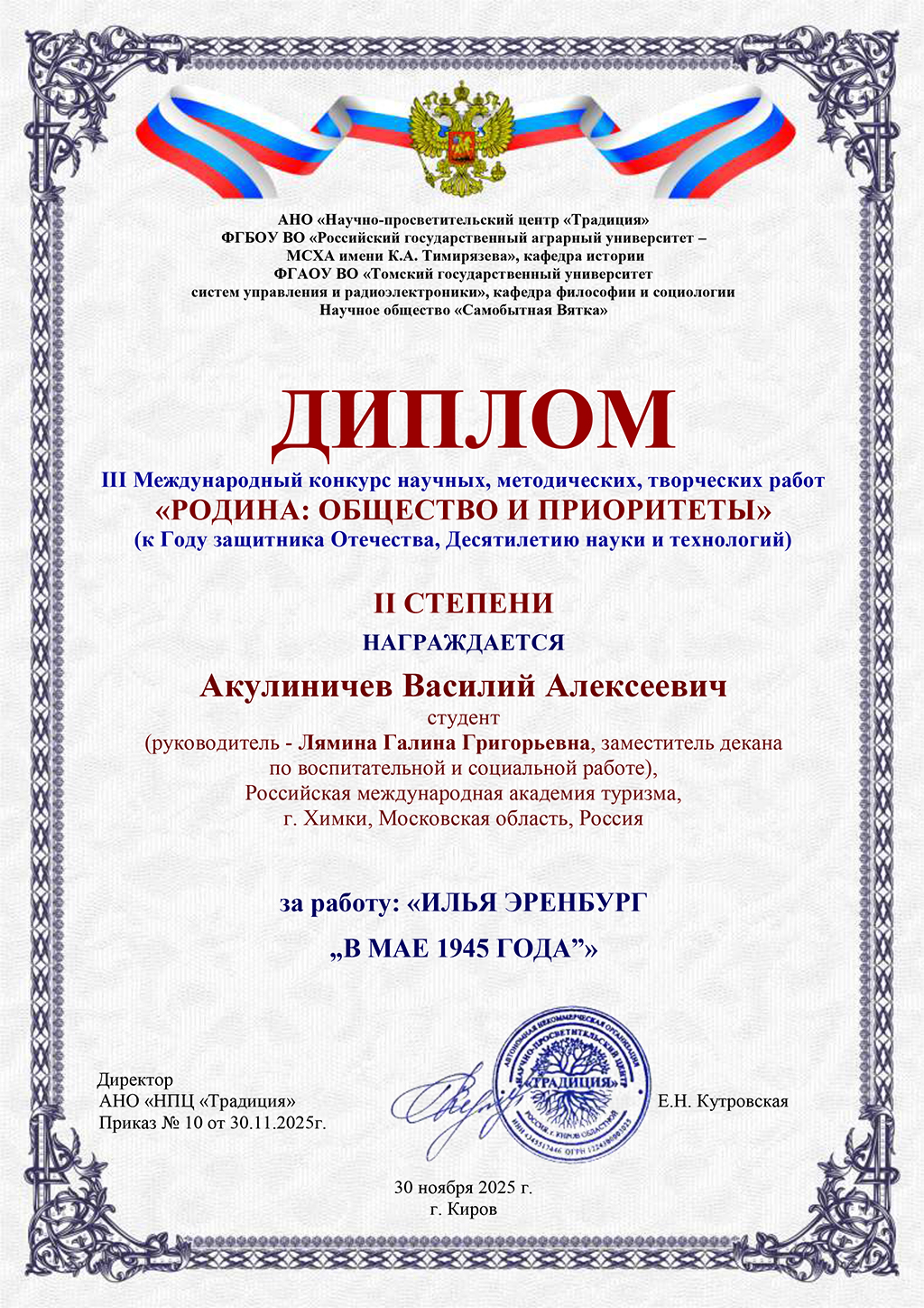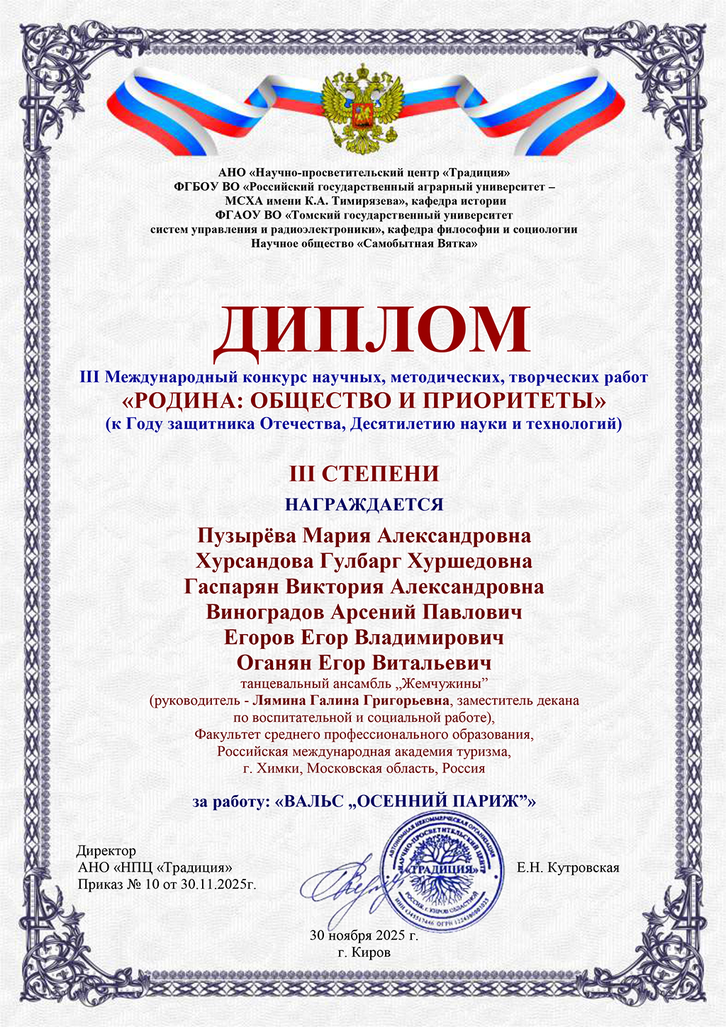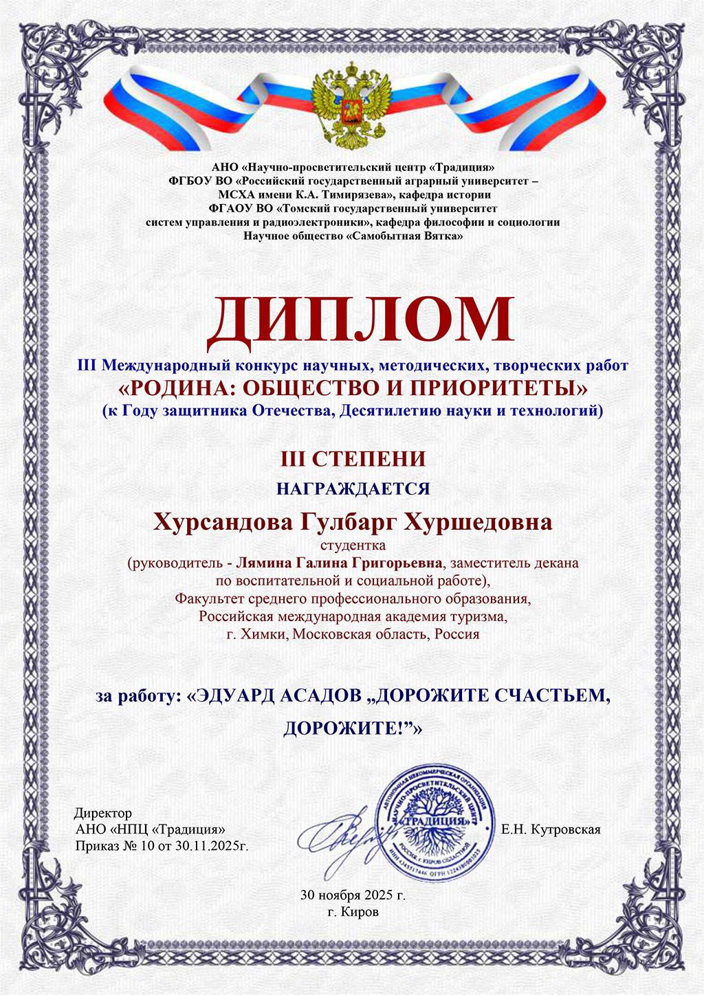 Наши талантливые студенты факультета среднего профессионального образования РМАТ приняли участие в III Международном конкурсе научных, методических и творческих работ «РОДИНА: ОБЩЕСТВА И ПРИОРИТЕТЫ», посвящённом Году защитника Отечества и Десятилетию науки и технологий, и продемонстрировали впечатляющие результаты. Конкурс стал площадкой для обмена опытом и демонстрации инновационных идей.